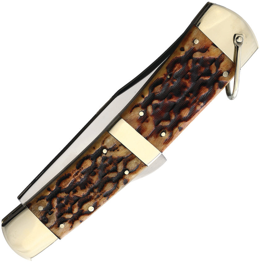6.25" (15.88cm) closed. 5" (12.7cm) mirror finish stainless clip point blade. Brown jigged bone handle. Nickel silver bolster(s). Boxed.