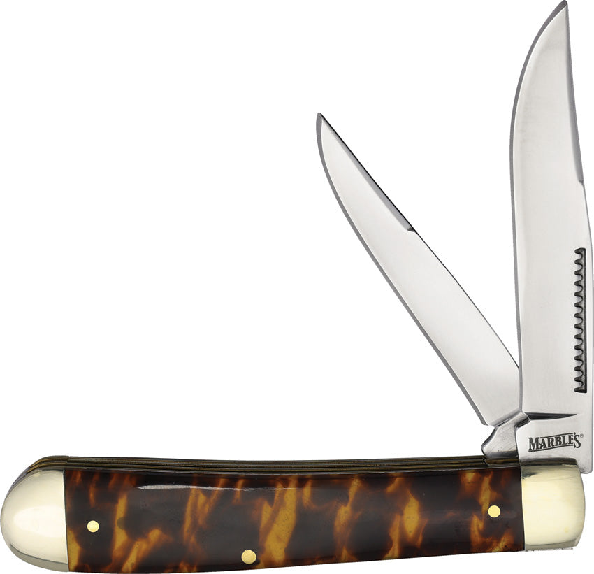 4" (10.16cm) closed. Mirror finish stainless clip and spey blades. Imitation tortoise shell handle. Nickel silver bolster(s). Boxed.