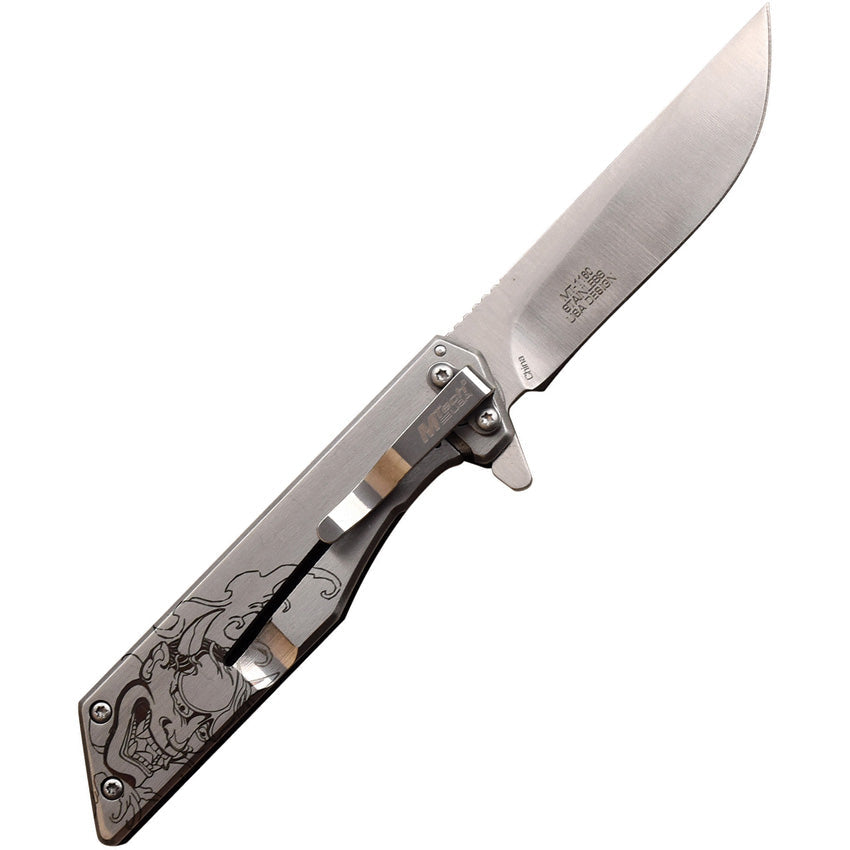 4" closed. 3" satin finish stainless blade. Black G10 handle with stainless back handle. Extended tang. Pocket clip. Devil artwork on back handle. Boxed.
