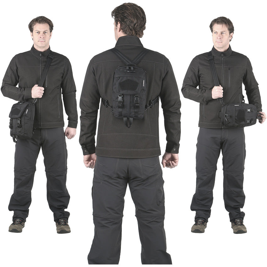 Dimensions: 5.5" x 7" x 12". Weight: 1lb. 6L capacity. Main compartment with two-way access. Padded bottom. Rear interior sleeve fits small tablet. 2.75" x 4.5" loop field for patches. Dual front compression straps with side release buckles. Top zippered flap pocket. Multiple grab handle on top and sides. 4" x 7" CCW compartment with security lockout strip. Assorted interior side wall mesh pockets. Zipper pulls with shrink wrapped webbing and plastic fobs. Skin-friendly seat belt webbing. 500D nylon construction. Color: Black.
