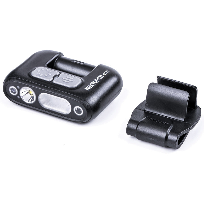 Water resistant. Impact resistant. Rechargeable. LED Infrared induction. Modes: High (220 lumens, 6h runtime); Low (28 lumens, 16h runtime). 53m beam distance. USB-C port. White, red, and blue LEDs. ABS construction. Color: Black. Boxed with hanging tab.