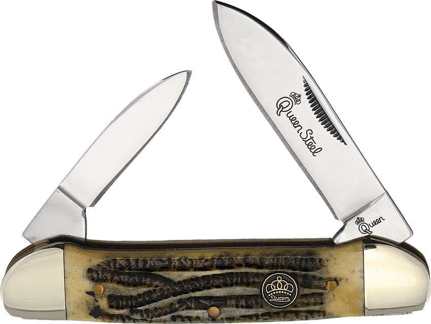 3.5" (8.89cm) closed. Mirror finish stainless spear and pen blades. Winterbottom jigged bone handle. Nickel silver bolster(s). Inlay shield. Boxed.