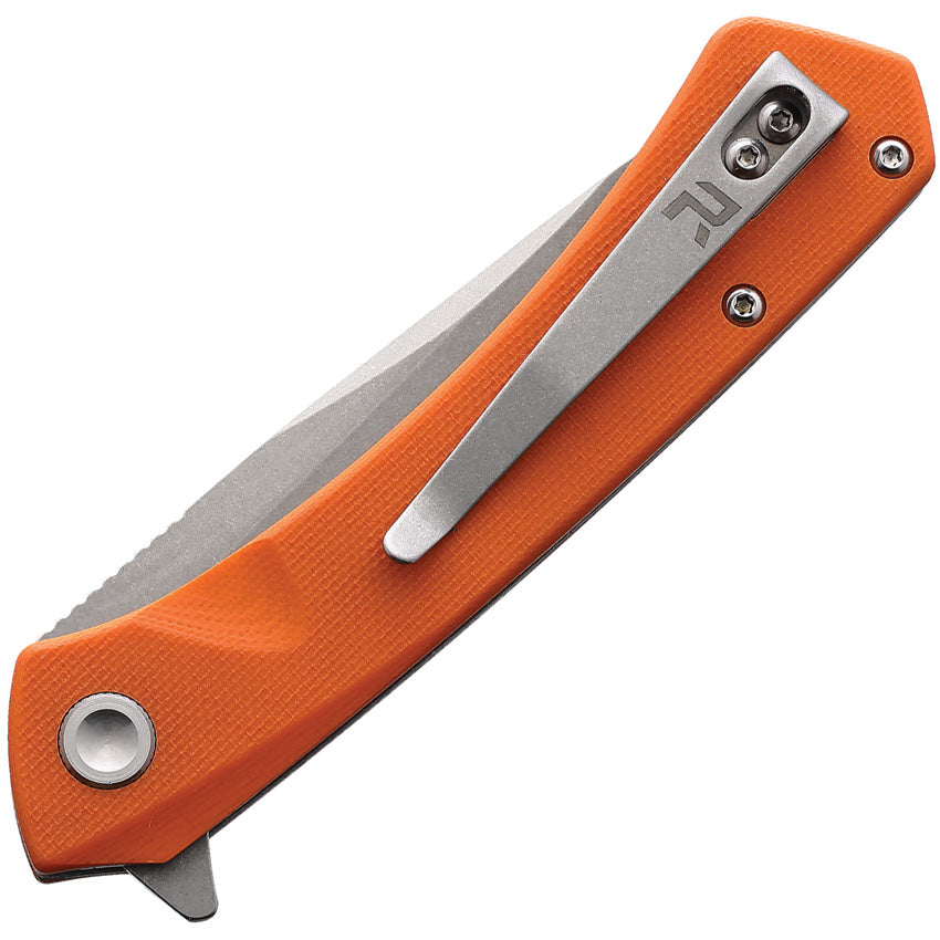 Assisted opening. 4.5" (11.43cm) closed. 3" (7.62cm) stonewash finish 9Cr18MoV stainless blade. Orange G10 handle. Extended tang. Boxed.
