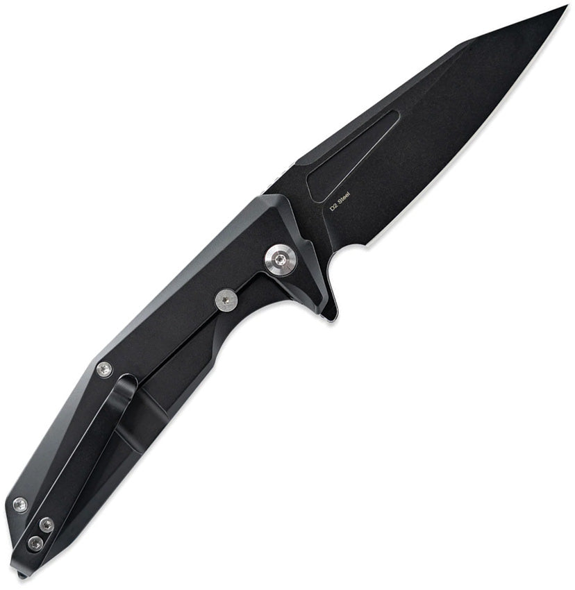 4.5" (11.43cm) closed. 3.38" (8.59cm) black PVD coated D2 tool steel blade. Black G10 handle with carbon fiber inlay. Extended tang. Pocket clip. Boxed.
