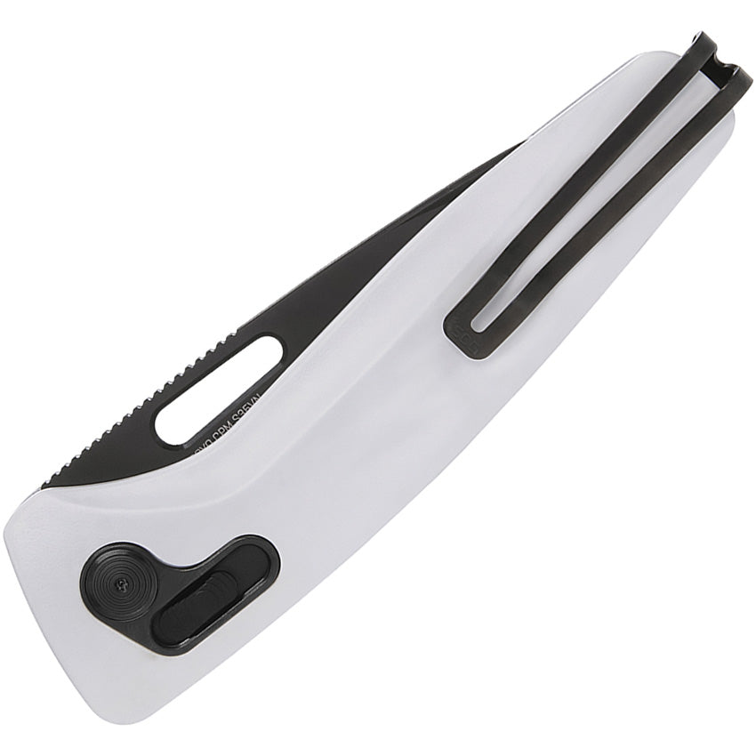 4.75" (12.07cm) closed. 3.13" (7.95cm) black TiNi coated CPM S35VN stainless clip point blade. White aluminum handle. Thumb pull. Pocket clip.