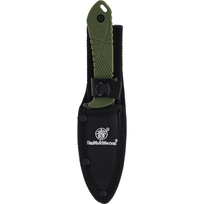 7.63" (19.38cm) overall. 3.25" (8.26cm) black stonewash finish stainless drop point blade. OD green synthetic handle. Full tang. Lanyard hole. Black polyester belt sheath. Clam packed.