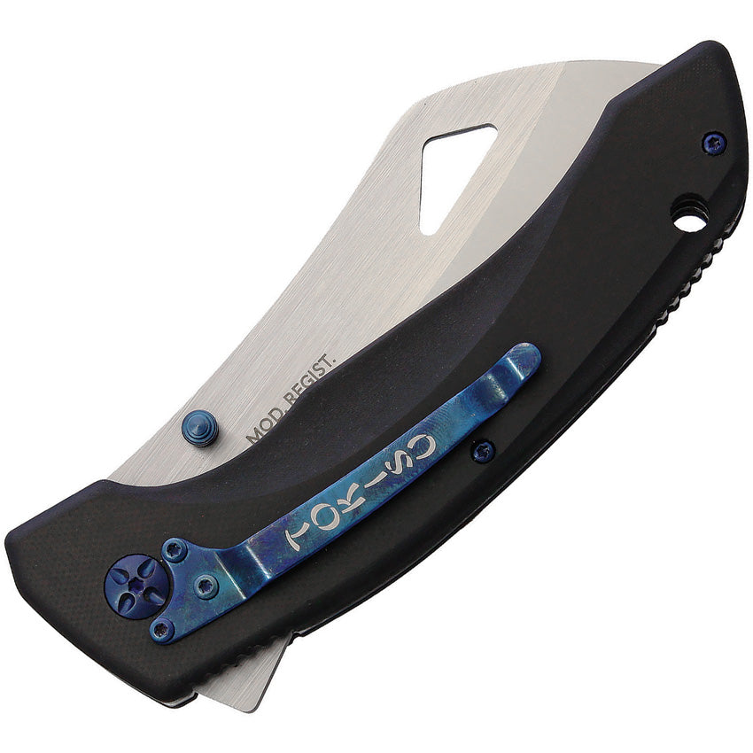 5.25" closed. 4" satin finish 7Cr17MoV stainless blade. Black G10 handle with carbon fiber inlay. Extended tang. Lanyard hole. Pocket clip. Boxed.