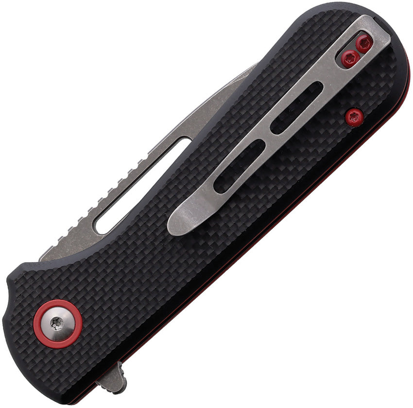 3.88" (9.86cm) closed. 3" (7.62cm) black stonewash finish stainless blade. Black G10 handle. Thumb pull. Extended tang. Pocket clip. Red liners. Boxed.