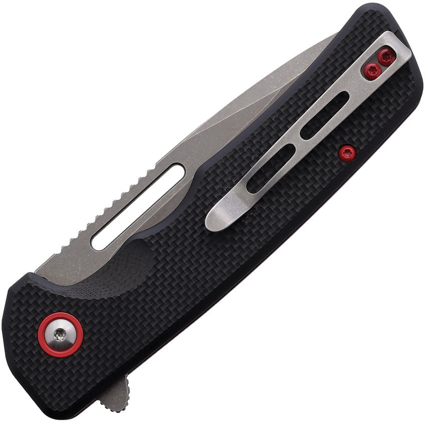4.5" (11.43cm) closed. 3.25" (8.26cm) stonewash finish stainless blade. Black G10 handle. Extended tang. Thumb pull. Pocket clip. Red liners. Boxed.