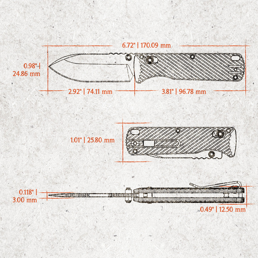 3.88" (9.86cm) closed. 2.88" (7.32cm) stonewash finish Bohler M390 stainless blade. Blue sculpted aluminum handle. Thumb stud. Pocket clip. Zulu blade. Quick-Swap scale system. Ball roll bar. Boxed.