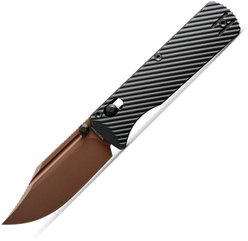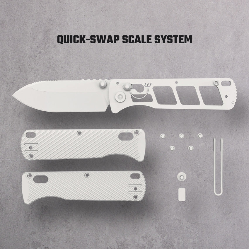 3.88" (9.86cm) closed. 2.88" (7.32cm) Bohler M390 stainless bowie blade. Black sculpted aluminum handle. Thumb stud. Pocket clip. Copper Dune finish blade. Quick-Swap scale system. Ball roll bar. Boxed.