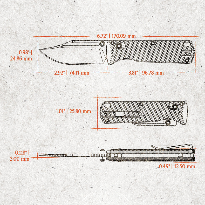 3.88" (9.86cm) closed. 2.88" (7.32cm) stonewash finish Bohler M390 stainless bowie blade. Blue sculpted aluminum handle. Thumb stud. Pocket clip. Quick-Swap scale system. Ball roll bar. Boxed.