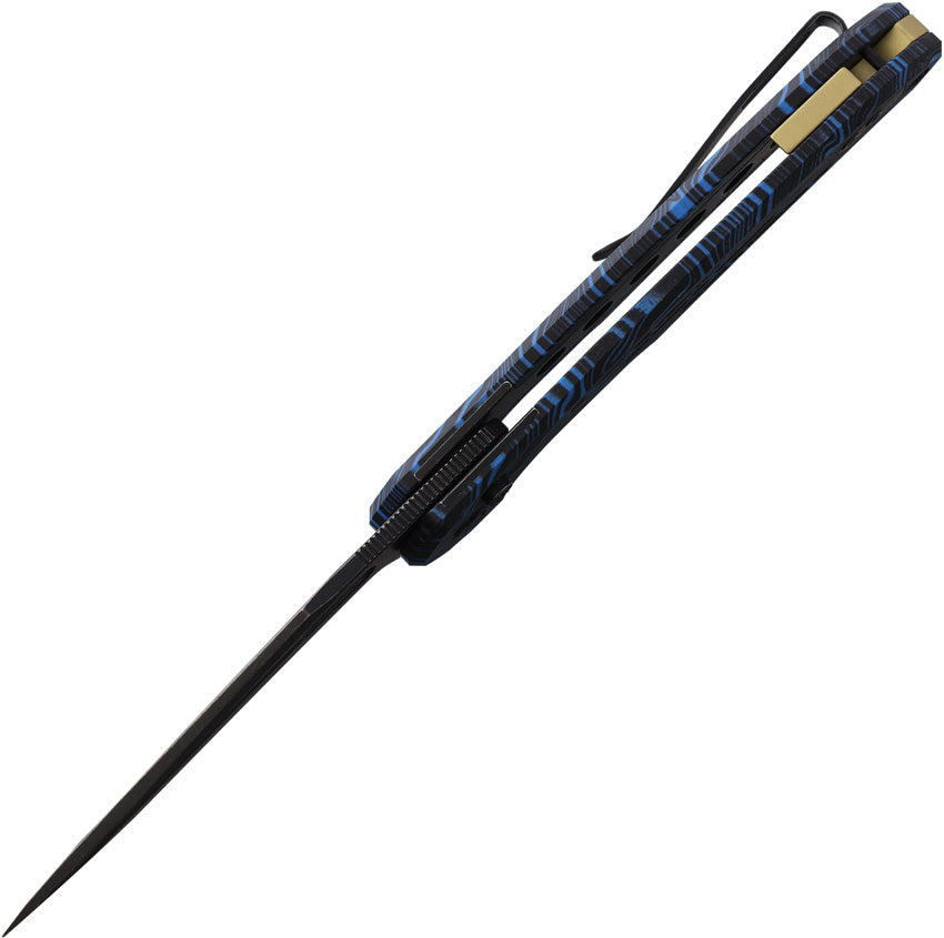 4.75" (12.07cm) closed. 3.5" (8.89cm) black stonewash finish Bohler M390 stainless tanto blade. Black and blue G10 handle. Extended tang. Pocket clip. Black nylon zippered storage case. Boxed.