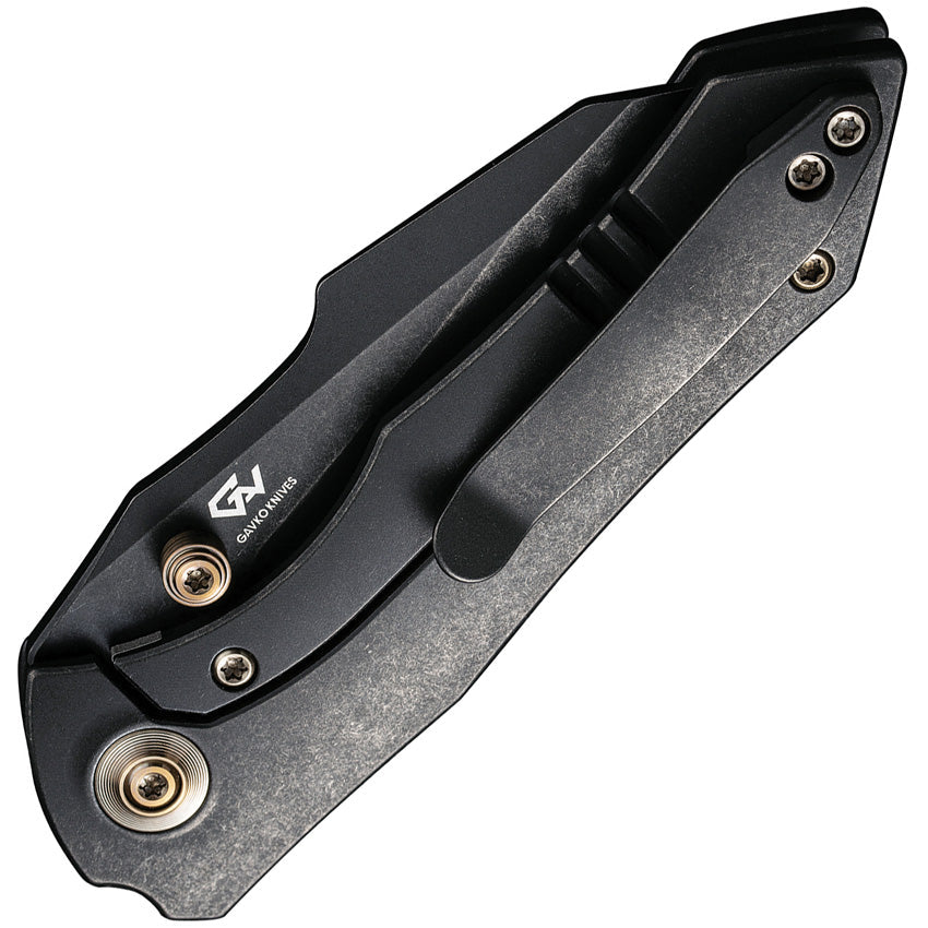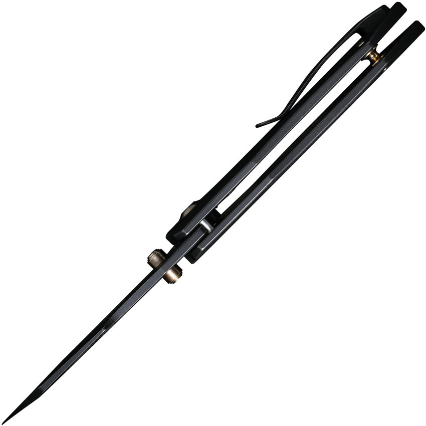 4" (10.16cm) closed. 3" (7.62cm) black stonewash finish CPM-20CV stainless blade. Black stonewash finish titanium handle. Thumb stud. Pocket clip. Black nylon zippered storage case. Boxed.