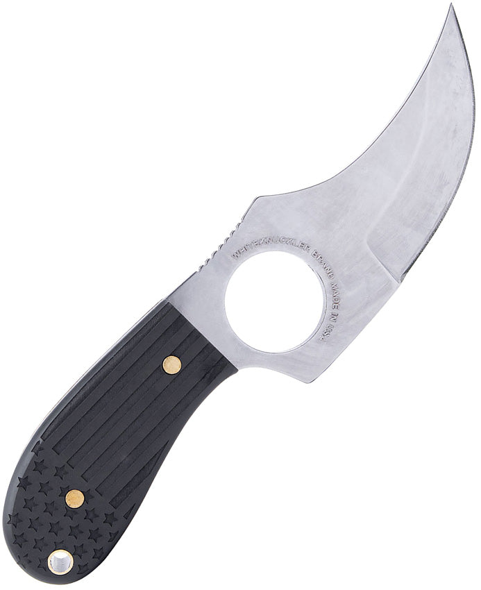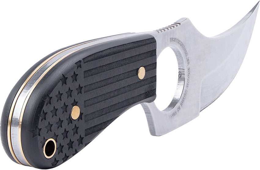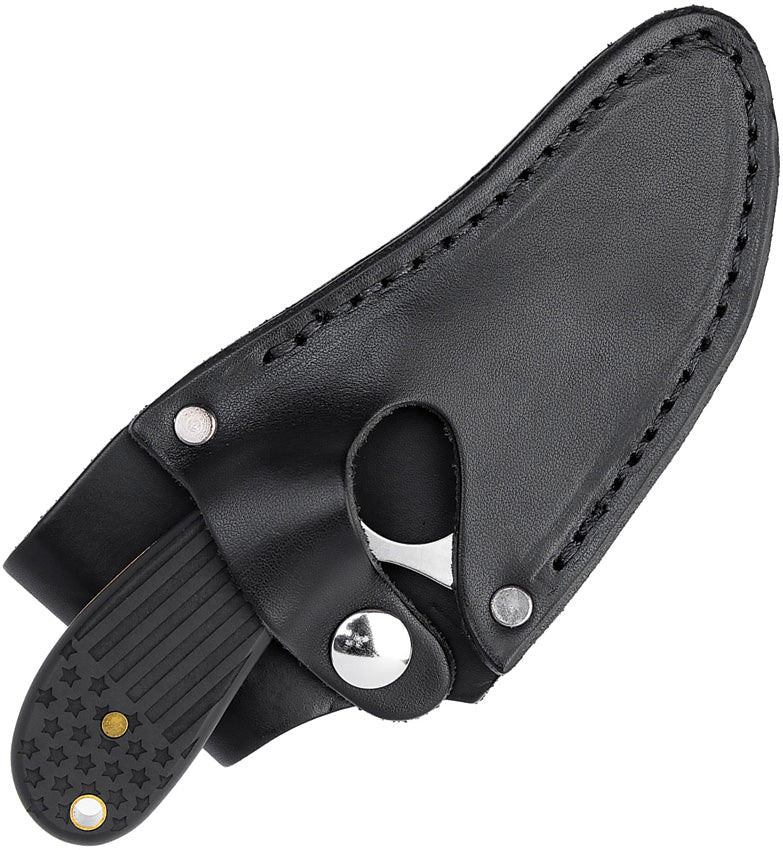 7" (17.78cm) overall. 3.5" (8.89cm) stonewash finish 154CM stainless blade. Black resin handle. Full tang. Lanyard hole. Finger ring. American flag sculpted handle. Black leather belt sheath. Boxed.
