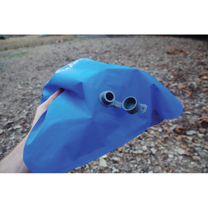 Dimensions: 19.5" x 12". Weight: 2oz. Can be used to inflate the sleeping pad and pillow. Just connect them, fill the bag with air and roll it down to fill. Water resistant. Storage bag. Bulk packed.