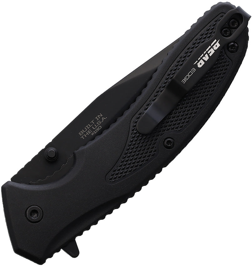 4.5" (11.43cm) closed. 3.5" (8.89cm) black finish stainless blade. Black Zytel handle. Thumb stud. Pocket clip. Extended tang. Boxed.