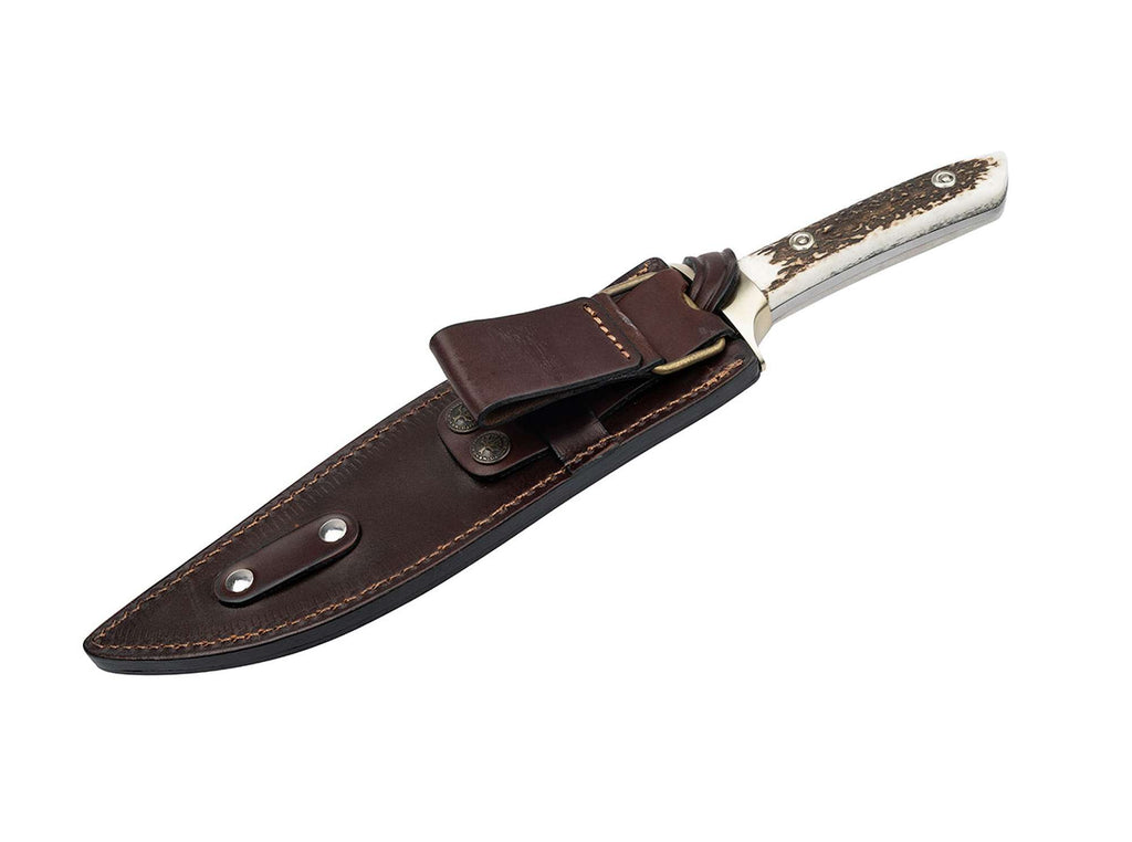 The extremely robust bowie knife in full tang construction has already inspired many outdoor enthusiasts and hunters. With its scales made of selected stag horn, it is now perfectly equipped for hunting and is convincing as a stand hunter knife, as well as an effective interceptor knife for wild boar, or the more powerful stag. The blade is made of ACX390 steel and has a stainless-steel paring element. Supplied with a high-quality leather sheath. Hilt 36.8 cm. Blade 23.5 cm. Thickness 6.4 mm. Weight 476 g.