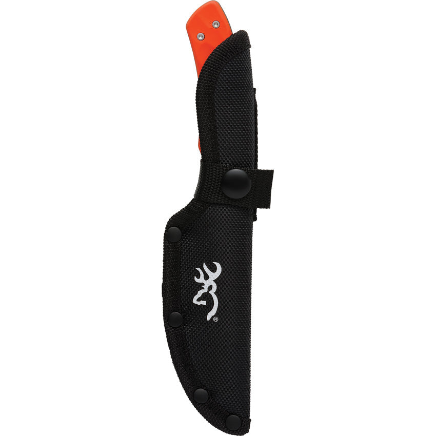8" (20.32cm) overall. 3.75" (9.53cm) satin finish stainless guthook blade. Orange rubber handle. Full tang. Black nylon belt sheath.