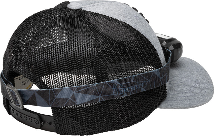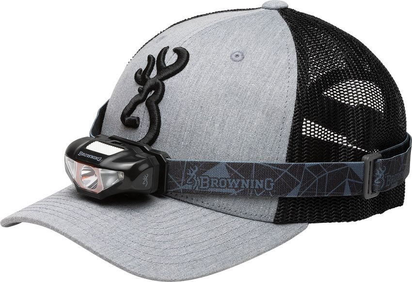 Water resistant. Impact resistant. Rugged polymer housing with high-impact lens wrap. Modes: High (100 lumens, 2h runtime); Low (25 lumens, 7h runtime); Green (10 lumens, 15h runtime). 46m beam distance. Adjustable head strap. Includes black and gray cap with Browning logo. Requires (1) AA battery (not included). Clam packed.