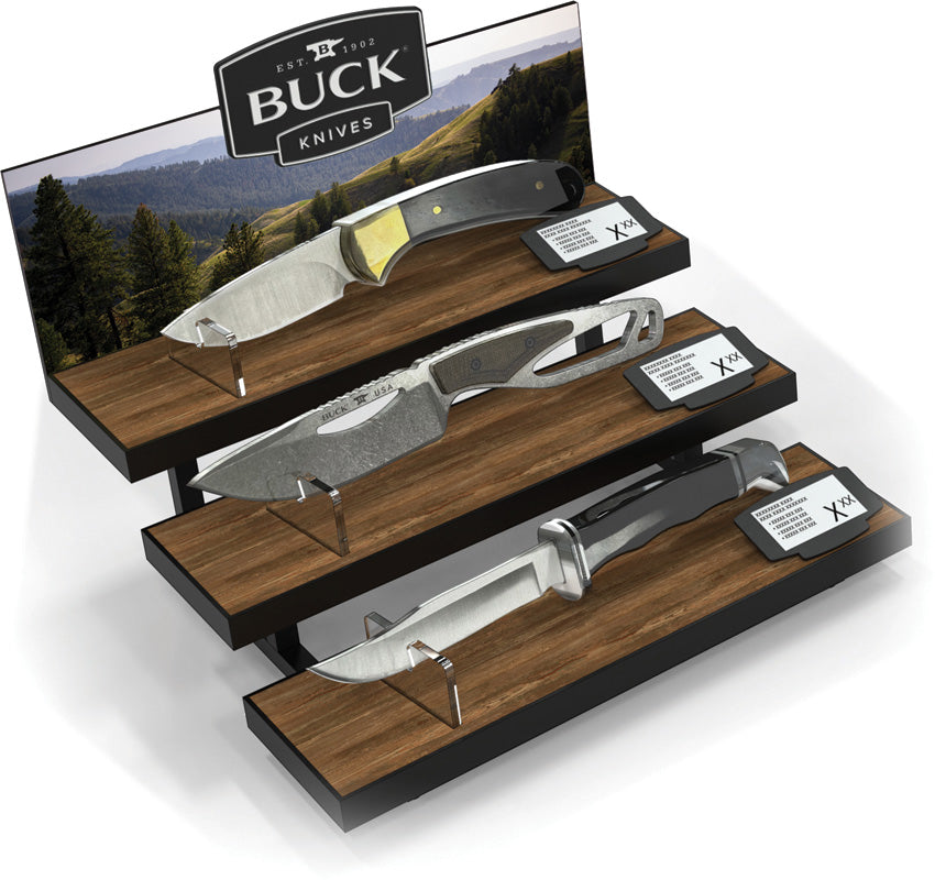 Dimensions: 9.13" x 9.5" x 10.5". Buck logo and branding. Magnetic landscape graphic. Three removeable product information tag holders that fit 2" x 1.25" tags. Access to pre-built knife content for display purposes. Knives pictured not included. Boxed.