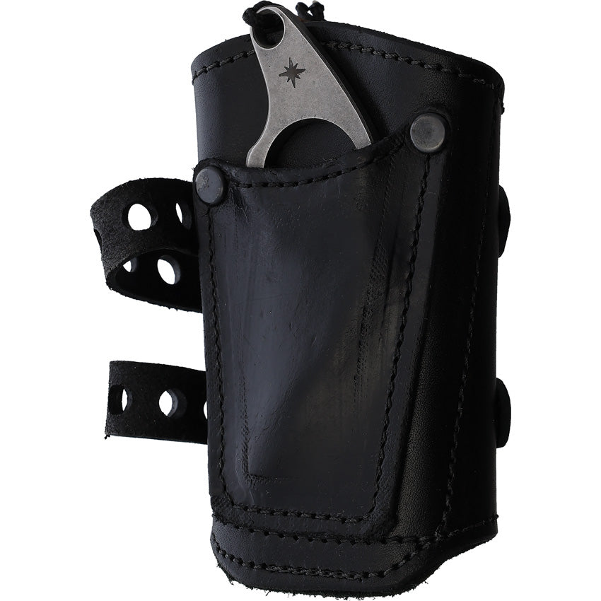 3.75" (9.53cm) overall. 1.75" (4.45cm) tumbled finish blade. One-piece construction. Lanyard hole. Satin finish tip AEB-H stainless blade. Hidden wallet inside cuff fits standard credit cards. Cuff dimensions: 5" x 3" x 3". Black leather construction and adjustable to fit arm size. Paracord lanyard with skull bead. Boxed.