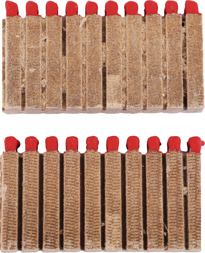 20 wooden fiber fire sticks per pack. Integrated strike pad on the box for easy lighting. Long burn time of 7 minutes each. Boxed with hanging tab.