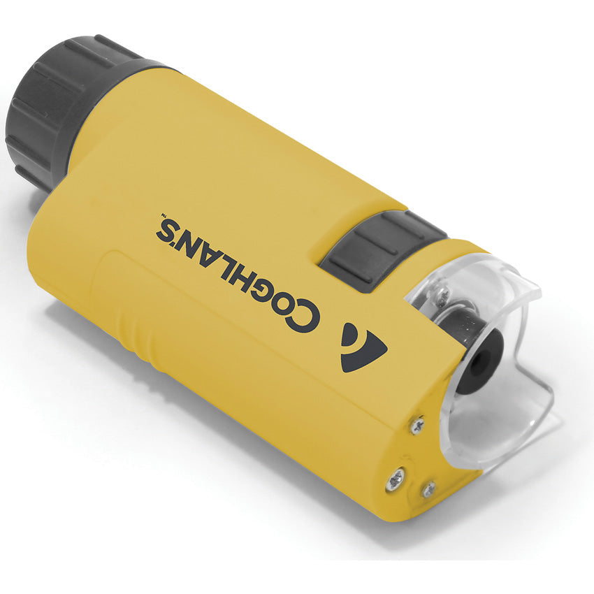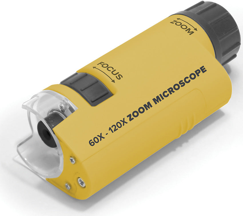 Dimensions: 3.46" x 1.46". 60 to 120 times magnification. Adjustment dials for zoom and focus. Integrated LED light. Boxed with hanging tab.