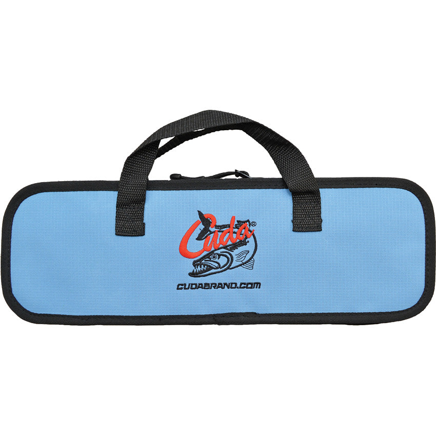 Blade: German 4116 Stainless; Handle: Blue l Synthetic; Other Info: Full Tang l Lanyard Hole. 14" overall chunk knife with 9" serrated blade, 11.75" overall boning with 6" blade, 11.75" overall fillet with 6" blade, and 7" overall bait knife with 2.5" blade. Titanium bonded blade. Non-slip Cuda scale pattern grips. Comes with small knife sharpener and balistic nylon zippered carry case. Boxed.