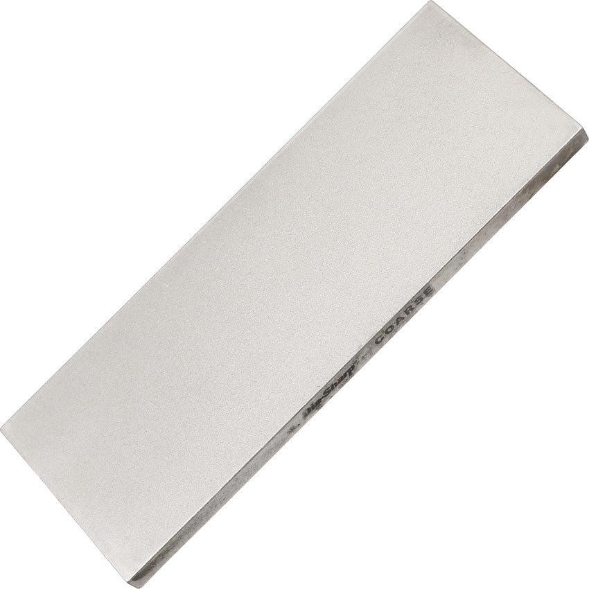 Measures 8" x 3" x 3/8". Continuous surface. Grit is clearly marked on side of stone. Includes non-skid rubber feet. Boxed with hanging tab.