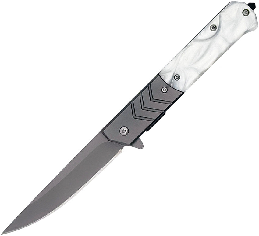 Assisted opening. 5.13" (13.03cm) closed. 4" (10.16cm) black stonewash finish 420C stainless blade. Imitation mother of pearl handle. Stainless bolster(s). Glass breaker. Extended tang. Pocket clip. Boxed.
