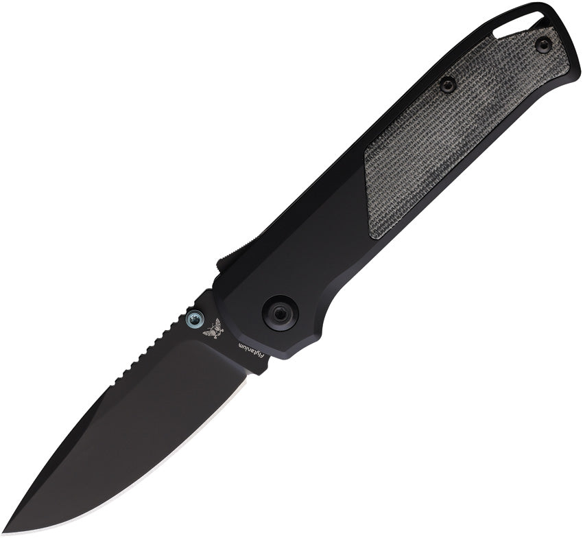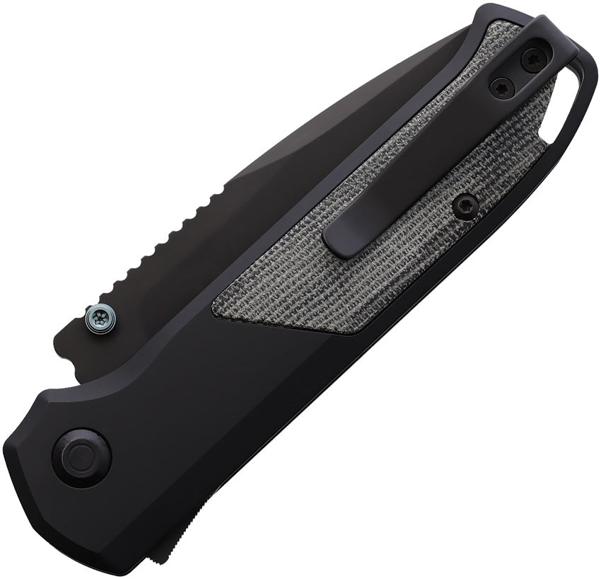4.5" (11.43cm) closed. 3.25" (8.26cm) black DLC coated S35VN stainless blade. Black aluminum handle with black micarta inlay. Extended tang. Lanyard hole. Pocket clip. Thumb stud. Extra set of black G10 handle inlays. Boxed.