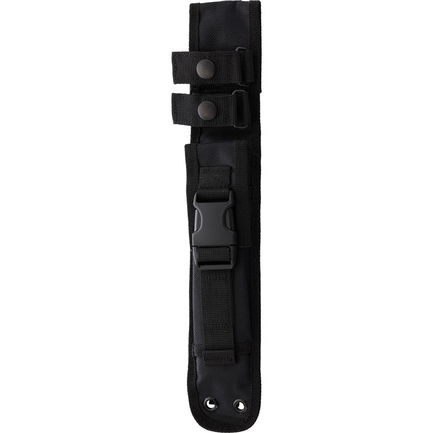 12" (30.48cm) overall. 6.75" (17.15cm) Battleworn finish double edge Elmax steel blade. Black and blue G10 handle. Full, extended tang. Lanyard hole. Partially serrated blade. Black nylon belt sheath. Boxed.
