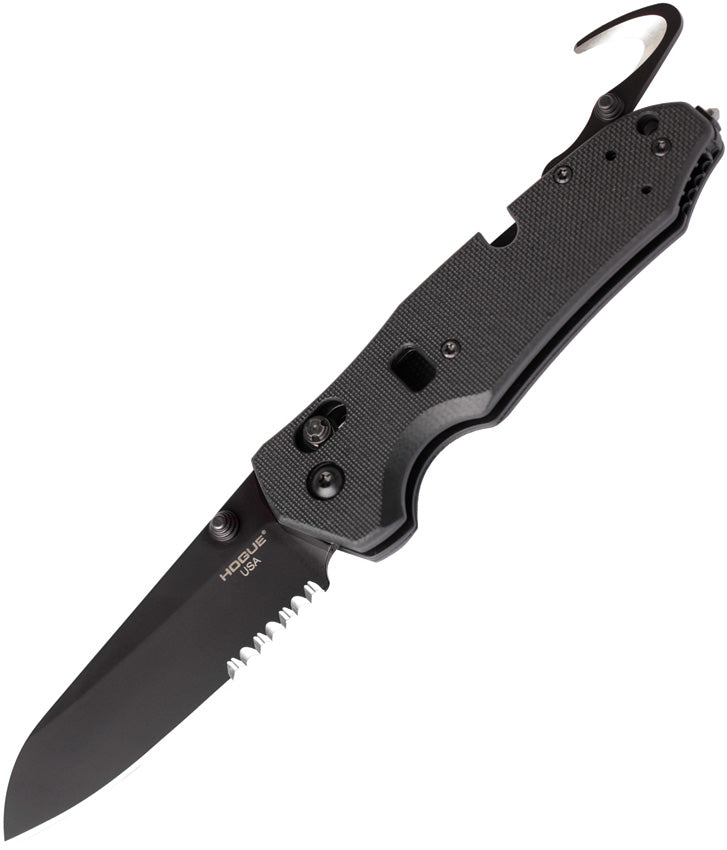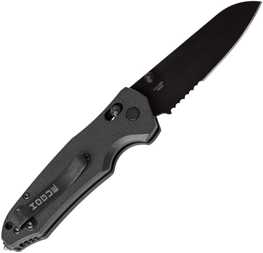 4.88" (12.4cm) closed. 3.38" (8.59cm) black Cerakote finish partially serrated Bohler N680 stainless sheepsfoot blade. Black G10 handle. Glass breaker. Lanyard hole. Thumb stud. Pocket clip. Belt/cord cutter with thumb stud deployment. Oxygen valve wrench. Boxed.