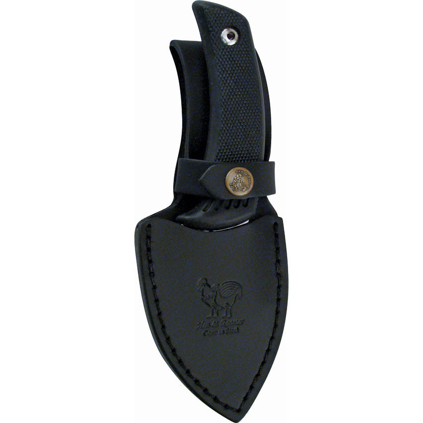 7.5" (19.05cm) overall. 3.13" (7.95cm) stainless guthook blade. Black checkered rubber handle. Lanyard hole. Black leather belt sheath. Boxed.