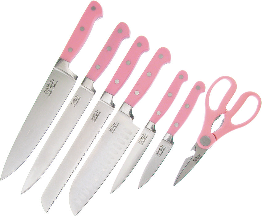 Stainless blade. Pink ABS handle. Storage block. Full tang. Includes: 13.25" overall kitchen with 8" blade; 13.25" overall slicing with 8" blade; 13" overall bread with 8" serrated blade; 12.75" overall Santoku with 7" blade; 9.75" overall utility with 5" blade; 8.25" overall paring with 3.5" blade; kitchen shears.