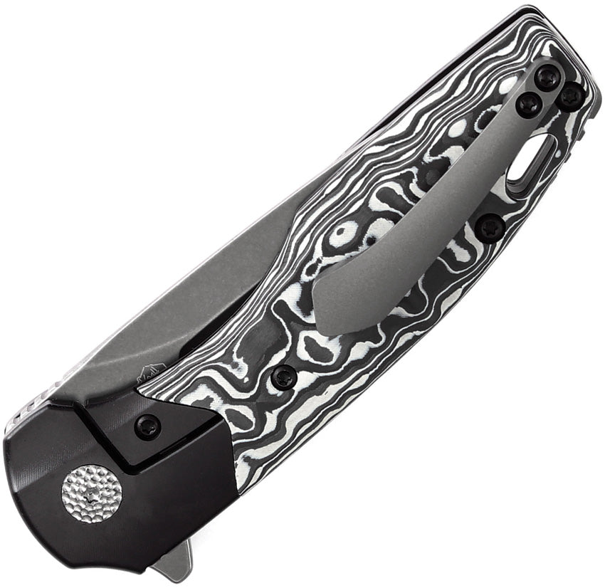 4" (10.16cm) closed. 3" (7.62cm) gray TiNi coated CPM S35VN stainless blade. Black stonewash finish titanium handle with Black and blue Nebula carbon fiber inlay. Extended tang. Lanyard hole. Pocket clip. Black nylon pouch. Boxed.