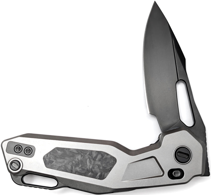 4" (10.16cm) closed. 3" (7.62cm) black titanium coated Bohler M390 stainless blade. Gray titanium handle with Shredded carbon fiber inlay. Extended tang. Thumb pull. Lanyard hole. Pocket clip. Boxed.