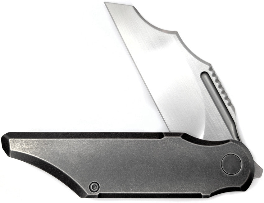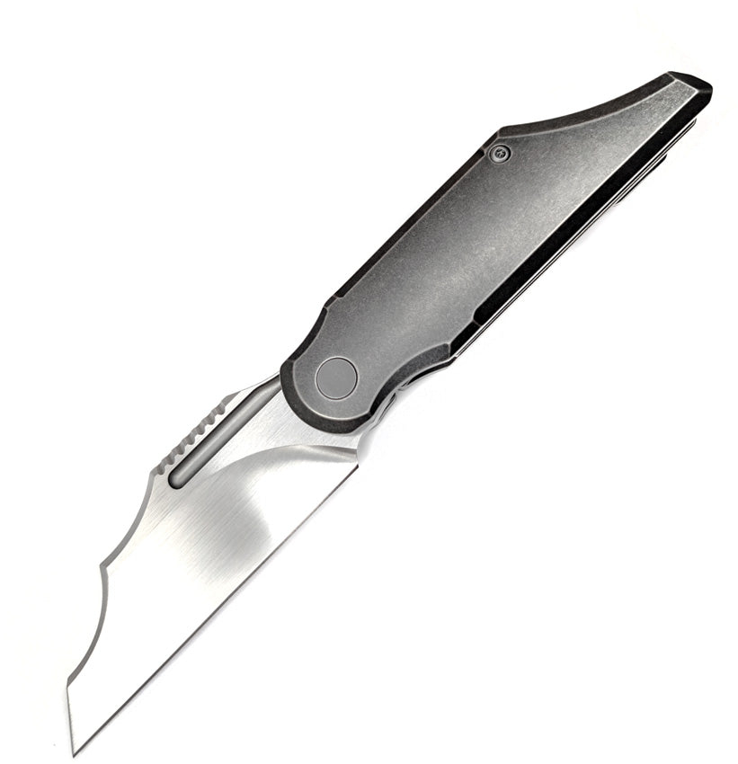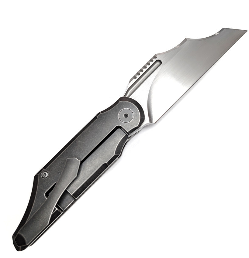 5.13" (13.03cm) closed. 4" (10.16cm) satin finish Bohler M390 stainless blade. Gray stonewash finish titanium handle. Pocket clip. Designed by Kevin Toole. Boxed.