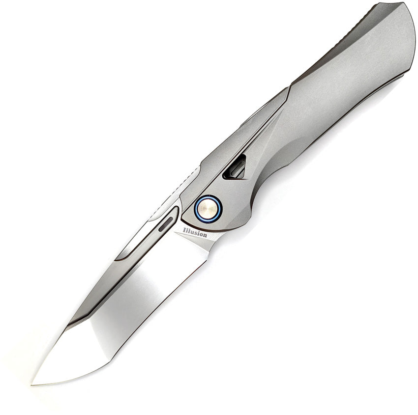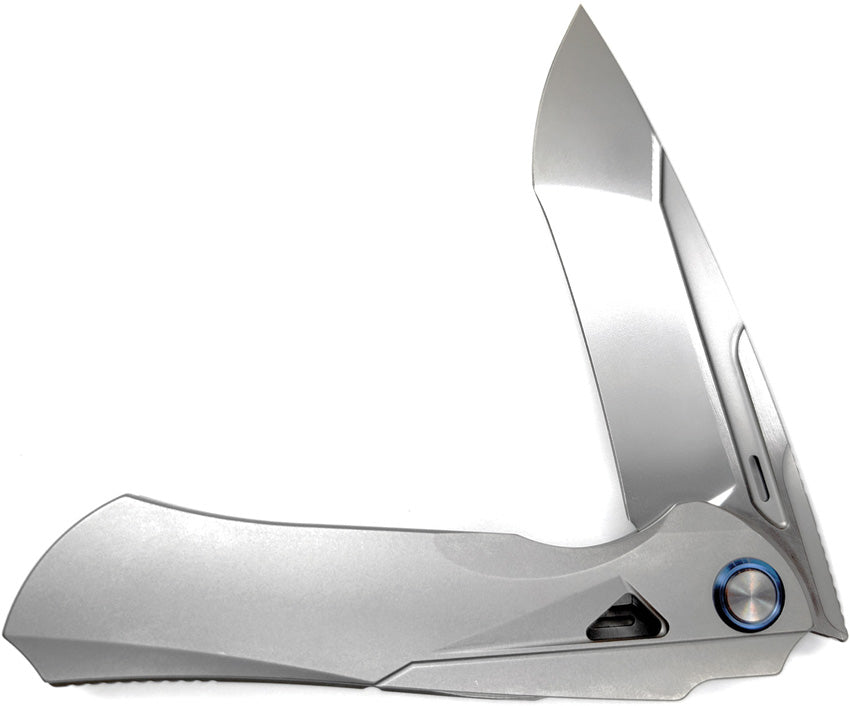 4.75" (12.07cm) closed. 3.5" (8.89cm) satin finish Bohler M390 stainless drop point blade. Gray titanium handle. Extended tang. Pocket clip. Boxed.