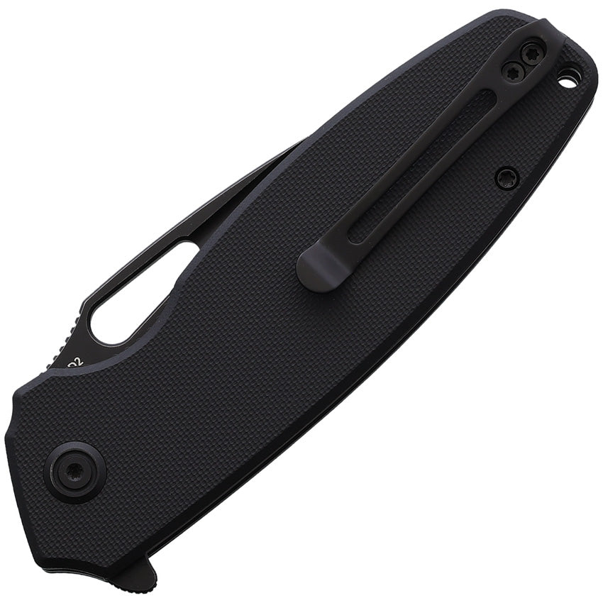 4.75" (12.07cm) closed. 3.38" (8.59cm) black finish D2 tool steel blade. Black G10 handle. Thumb pull. Extended tang. Lanyard hole. Pocket clip. Boxed.