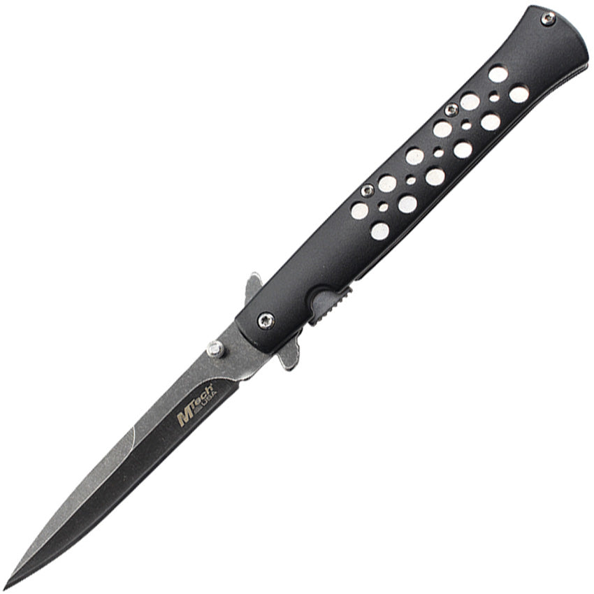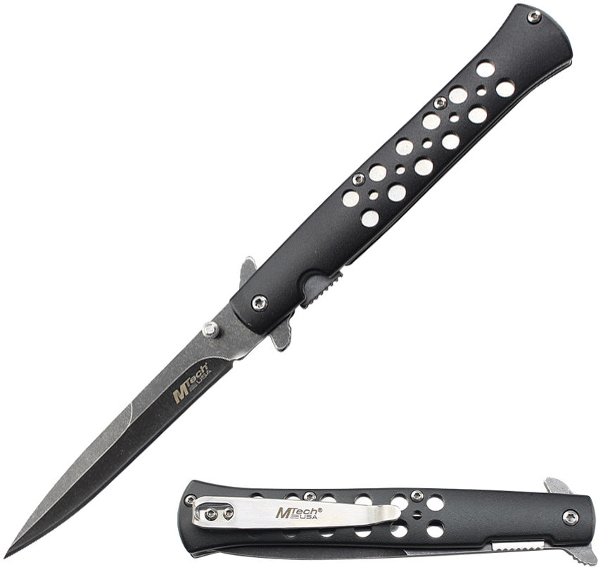 Assisted opening. 5" (12.7cm) closed. 4" (10.16cm) black stonewash finish 3Cr13MoV stainless blade. Black aluminum handle. Extended tang. Thumb stud. Pocket clip. Boxed.