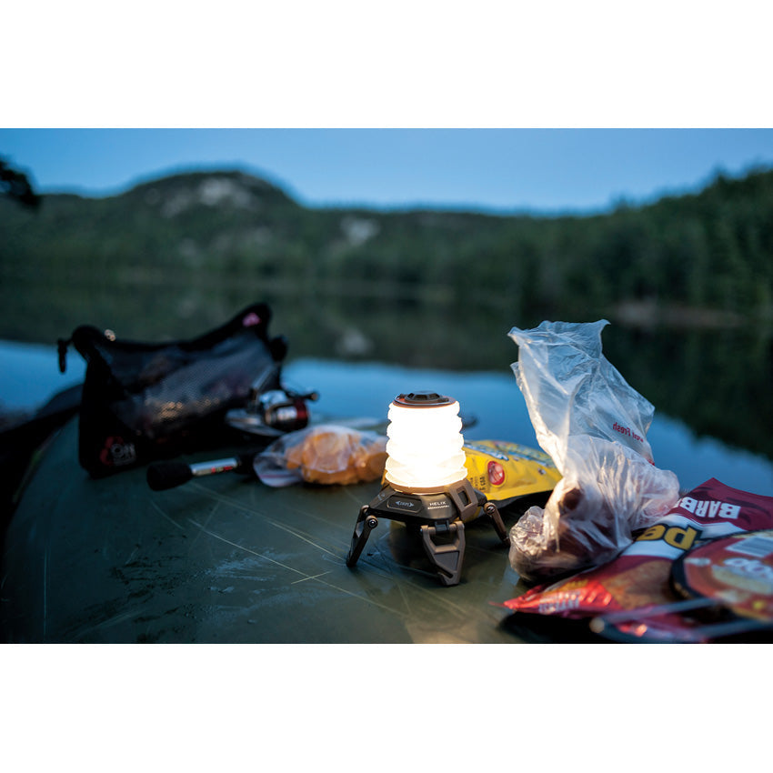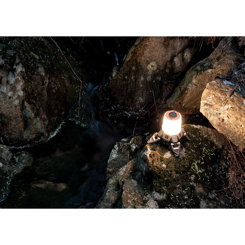 Water resistant. Impact resistant. Dimmable. Modes: White high (300 lumens, 4.5h runtime); White low (30 lumens, 100h runtime); Red high (10 lumens, 12h runtime); Red low (1 lumen, 250h runtime). Glow-in-the-dark collapsible globe. Folding legs. Requires (3) AAA batteries (not included).