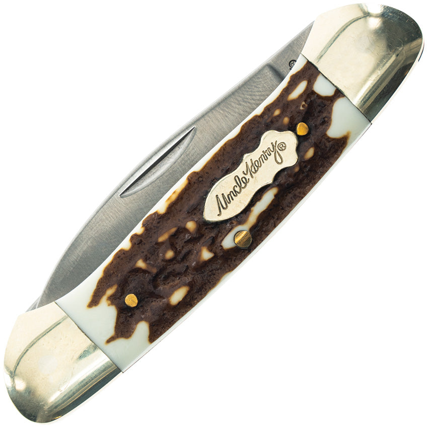 Oncle Henri. 3,63" (9,22 cm) fermé. Lames de lance et de stylo en acier inoxydable 7Cr17MoV finition satinée. Manche Staglon. Traversin(s) en maillechort. Bouclier incrusté.