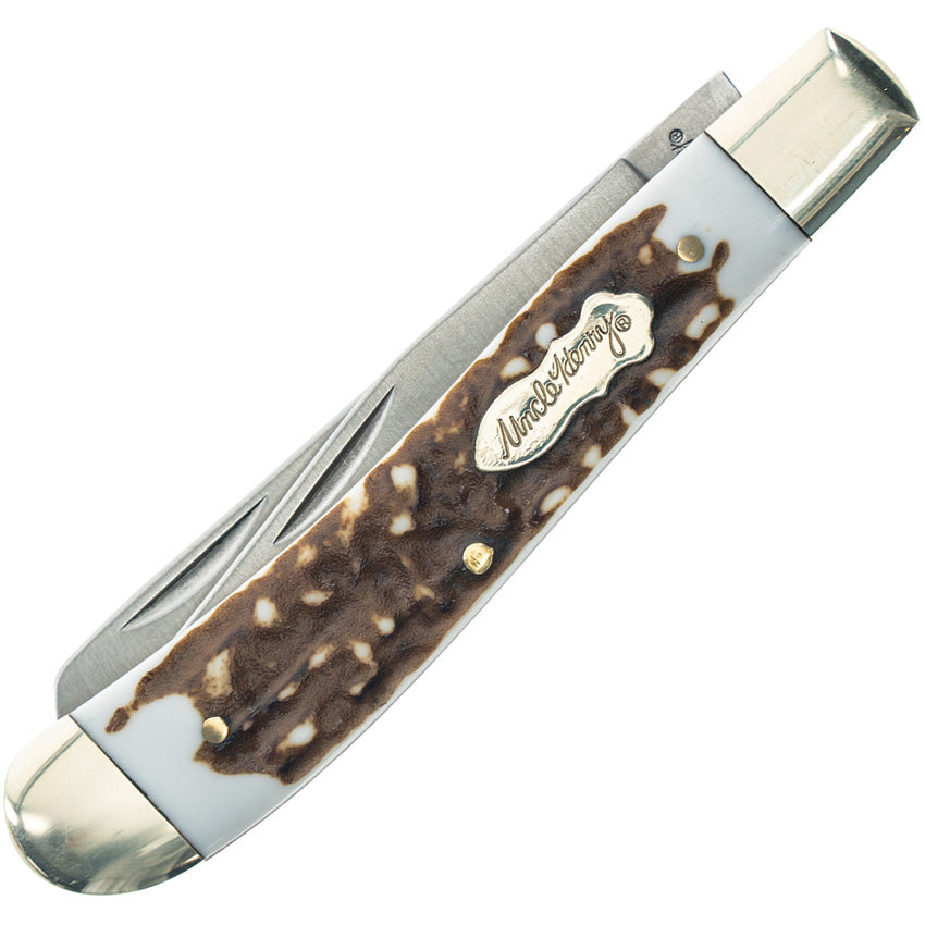 Oncle Henri. 3.88" (9.86cm) fermé. Agrafe et lames Spey en acier inoxydable 7Cr17MoV finition satinée. Poignée Staglon. Traverse(s) en maillechort. Bouclier incrusté.