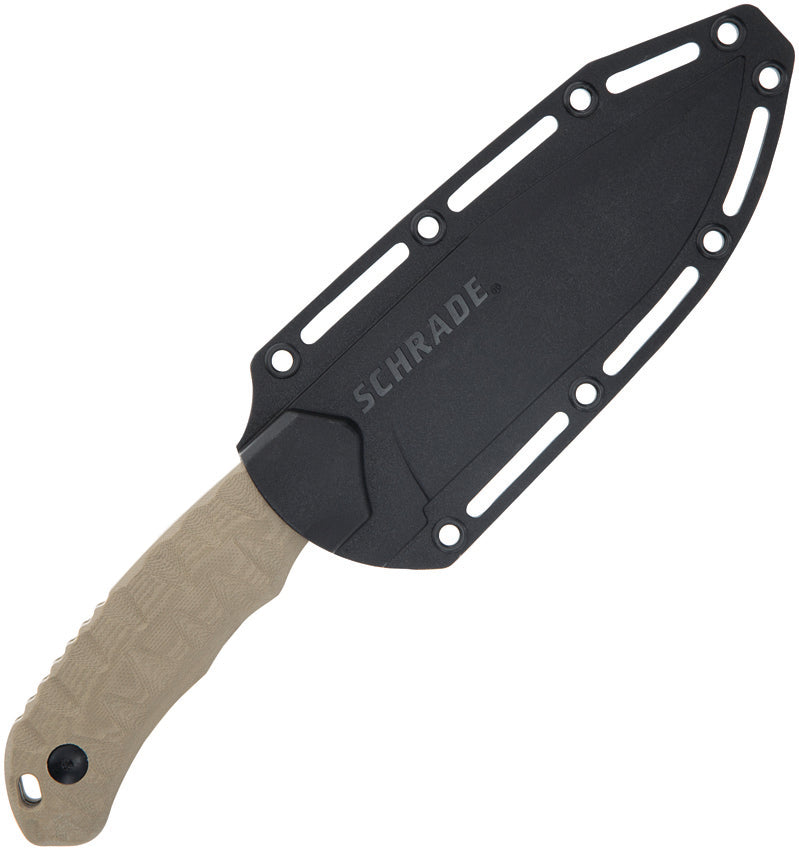 10" (25,4 cm) au total. Lame en acier inoxydable AUS-8 de 5" (12,7 cm) finition noire. Poignée G10 sculptée tan. Pleine soie. Trou de lanière. Etui de ceinture synthétique noir. Palourdes emballées.
