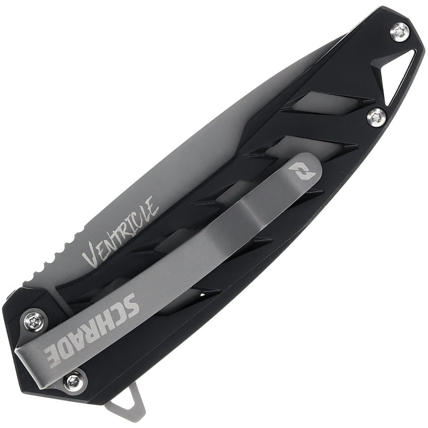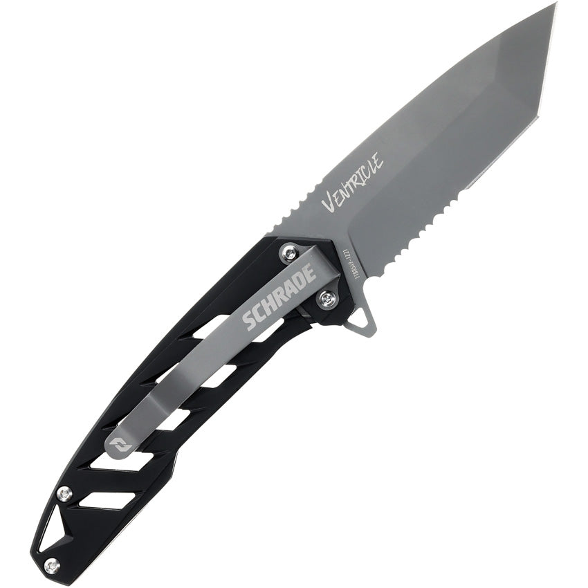 4" (10.16cm) closed. 3" (7.62cm) gray TiNi coated partially serrated AUS-10A stainless tanto blade. Black stainless handle. Extended tang. Lanyard hole. Pocket clip. Clam packed.