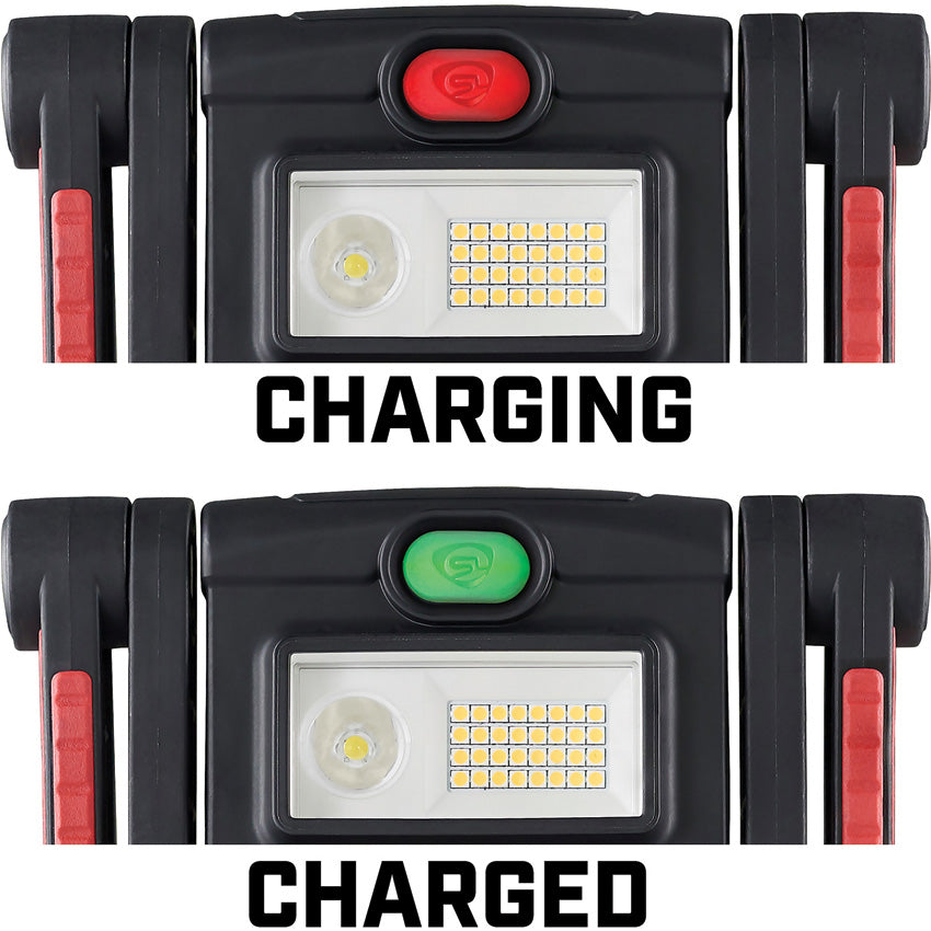 Rechargeable. Water resistant. Impact resistant. Modes: Spot-High (1000 lumens, 4h 30m runtime); Medium (450 lumens, 8h 45m runtime); Low (325 lumens, 12h 30m runtime); Flood-High (2000 lumens, 2h 30m runtime); Medium (1000 lumens, 5h runtime); Low (575 lumens, 8h 45m runtime). Recessed power button with charge status indicator. Secure cord connection. Multi-function. 174m beam distance. Clamps virtually anywhere. Stands on its own. Requires (1) Lithium battery (included). Boxed.