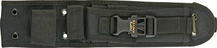 10 7/8" hors tout. Lame en acier au carbone 1095 de 5 1/2" avec revêtement de traction noir. Pleine soie. Poignées G-10 vertes et noires superposées. Fourreau de ceinture en nylon balistique noir avec poche pour accessoires et lien de jambe.