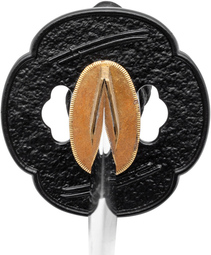 41.5" (105.41cm) overall. 29" (73.66cm) double edge T10 High-Speed Tool Steel blade. Brass habaki. Black metal tsuba with embossed design. Cream-colored rayskin and black cord wrapped handle with black and brass dragon menuki. Black wood scabbard. Boxed.